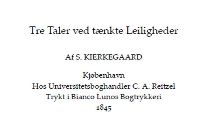 Over fire formiddage fra november til februar læses i fællesskab Søren Kirkegaards opbyggelige taler: ,Tre Taler ved tænkte Leiligheder', 1845.